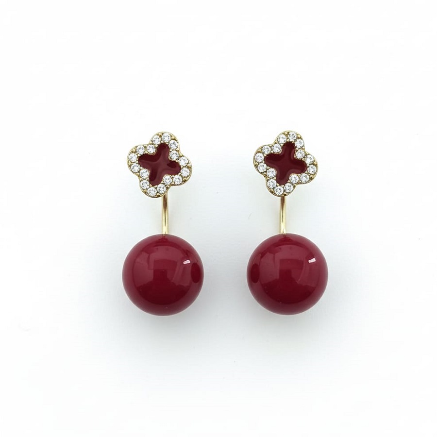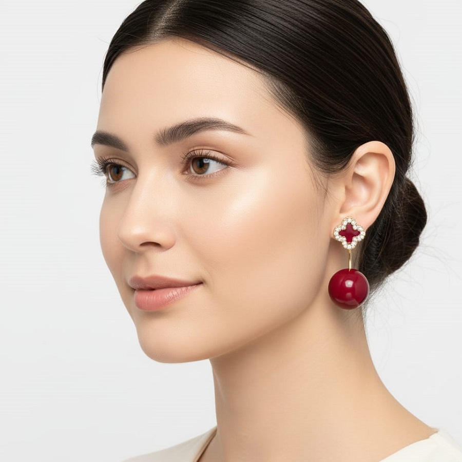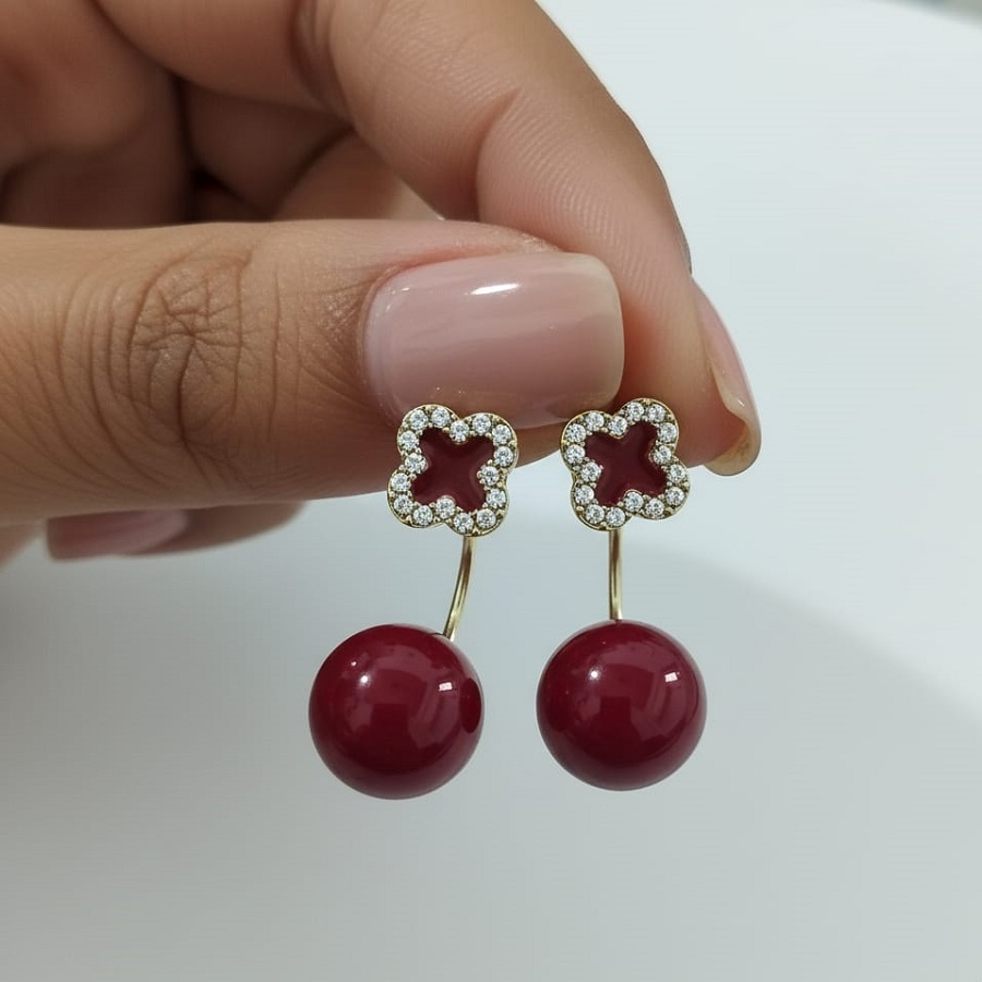 • Innovative Front-Back Design: These earrings feature a unique “ear jacket” style where a sparkling clover stud is worn in front, and a rich red pearl curves from behind the earlobe.