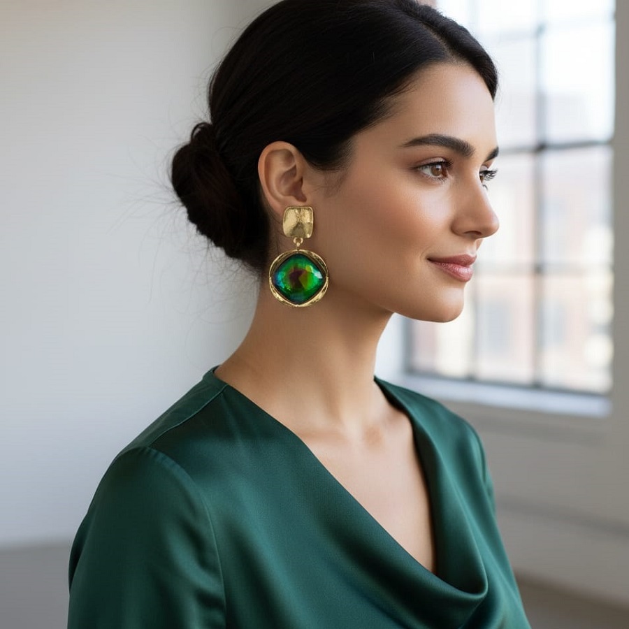 Add a touch of bold elegance to your look with these stunning Iridescent Gemstone Drop Earrings. Crafted with a gold-tone metal base, each earring features a faceted, color-shifting stone that reflects mesmerizing hues of green, blue, and violet. The hammered gold square stud adds a touch of artisanal charm, while the smooth, rounded setting enhances the brilliance of the central gem.