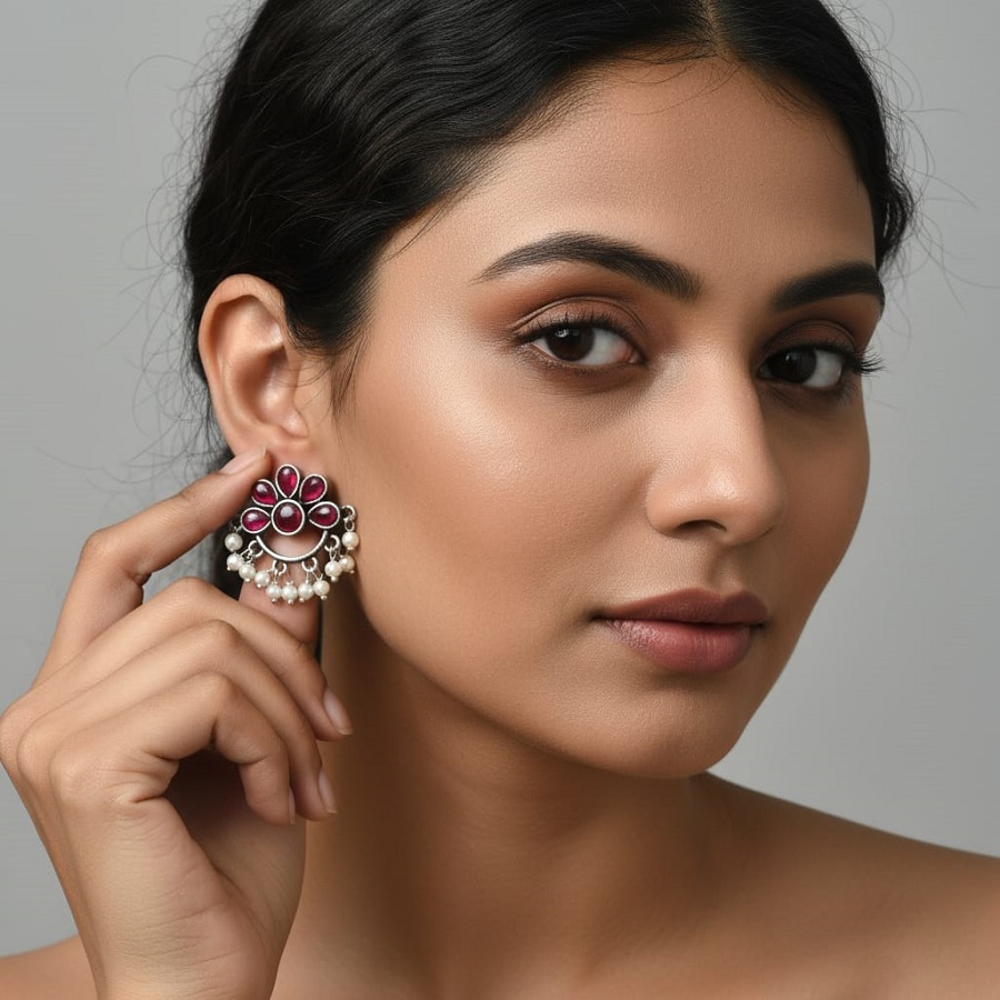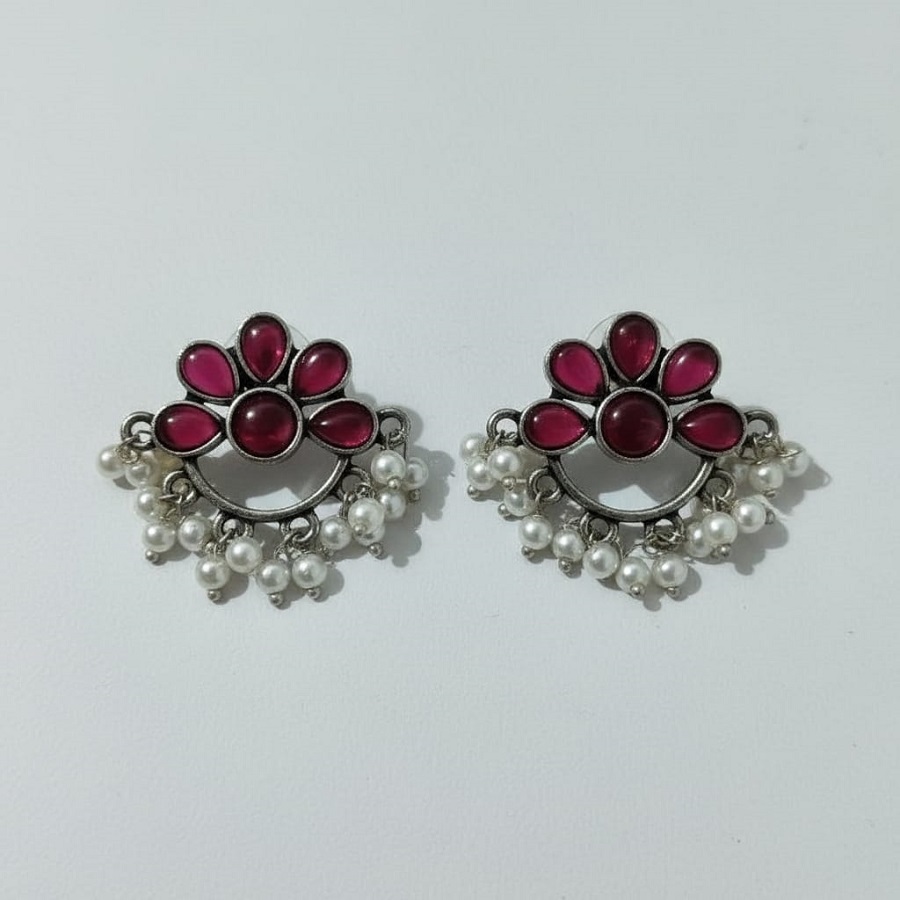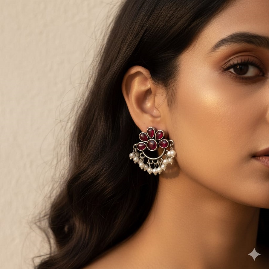 raditional Pearl and Ruby Studded Fan-shaped Drop Earrings