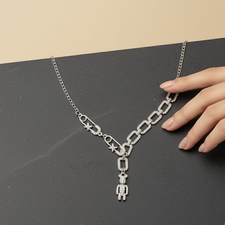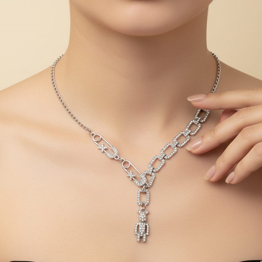 Be the first to review “Silver-Plated Stones Studded Link Chain With Teddy Bear Pendant”
