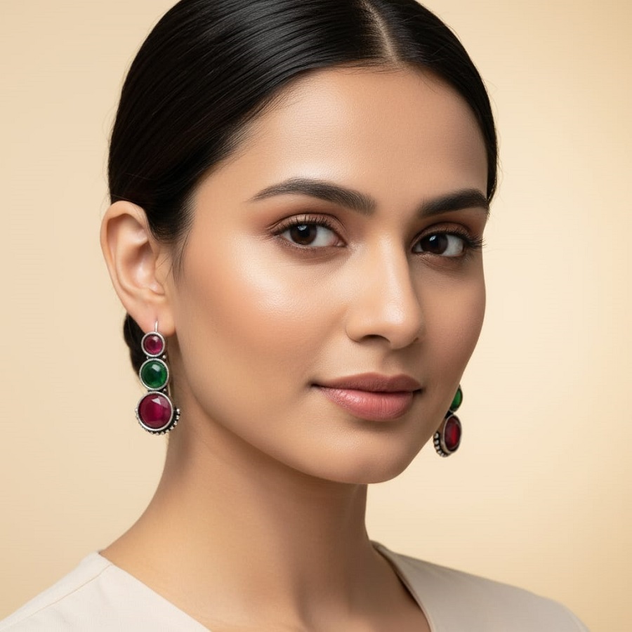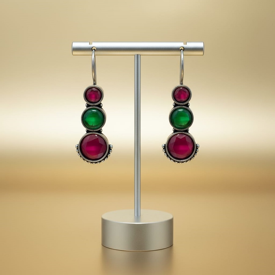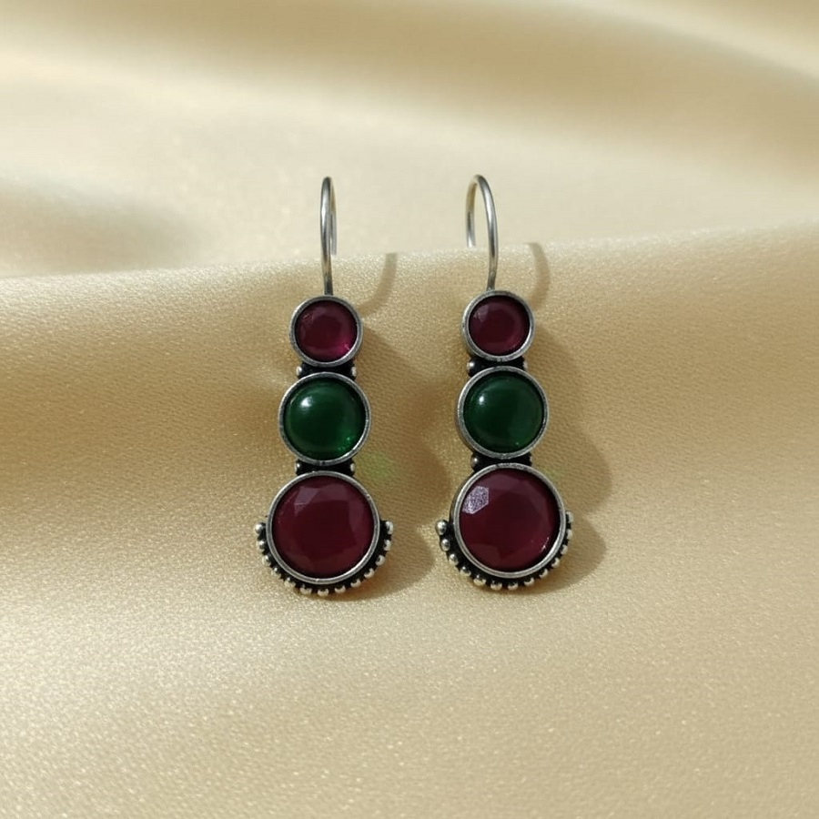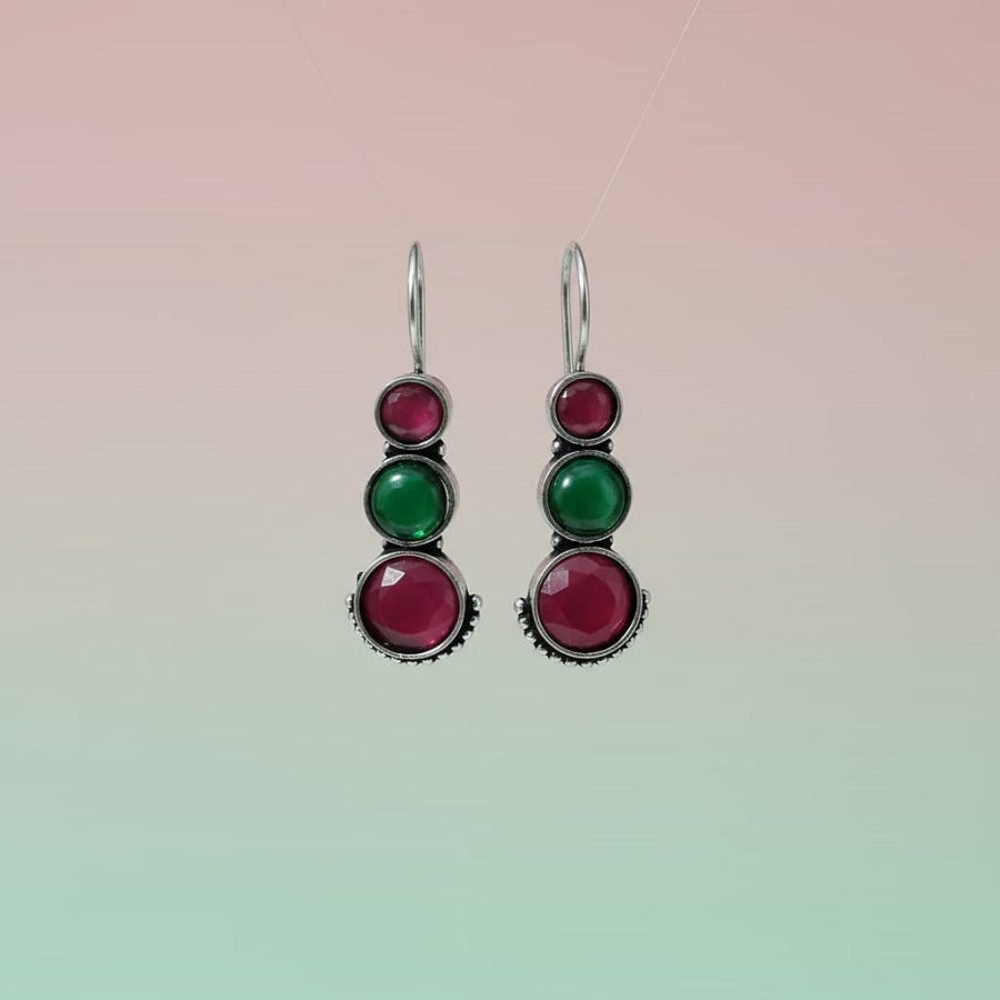 These elegant oxidized silver drop earrings feature a striking vertical arrangement of vibrant gemstones. Each earring showcases three distinct circular stones, meticulously set within a finely crafted oxidized silver frame. At the top, a smaller crimson-hued stone leads to a brilliant emerald green gem in the middle, culminating in a larger, rich ruby red stone at the bottom. The oxidized finish provides a beautiful antique contrast to the vivid colors of the gemstones, highlighting their brilliance. Designed with a classic hook closure, these lightweight earrings are comfortable for extended wear and are perfect for adding a sophisticated pop of color and traditional charm to any ensemble, from festive wear to chic everyday outfits.